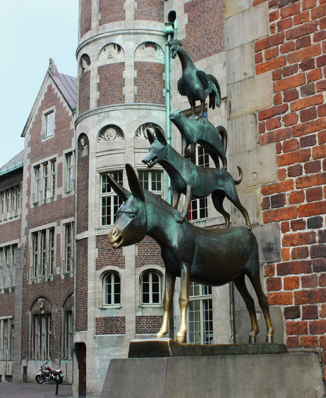 Съезд с трассы и въезд в город прошёл гладко. Оставив машину недалеко от исторического центра, мы направились на поиски скульптуры знаменитых «Бременских музыкантов». Как я заметил такие скульптуры находятся в неприметных местах. «Писающий мальчик» в Брюсселе установлен на перекрёстке узеньких улочек, а в Бремене памятник «поющей четвёрке» в неприметном месте у стены Ратуши. Однако, благодаря своей известности, «тропа» к скульптуре «протоптана» хорошо.