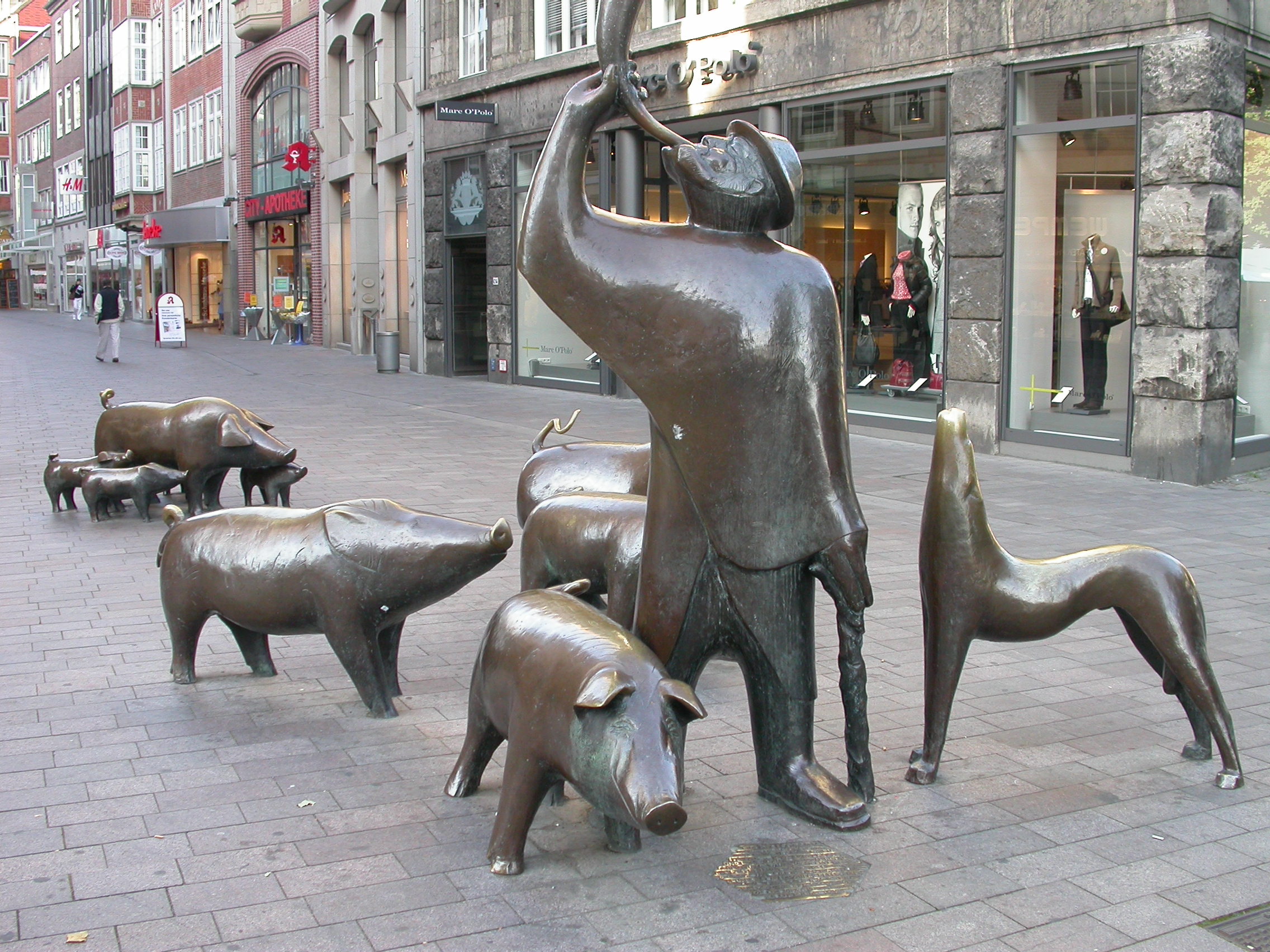 Когда-то по этой улице Зёгештрассе гоняли свиней на рыночную площадь, и вот много лет спустя это событие скульптор Питер Леманн увековечил и подарил городу в 1974 году.