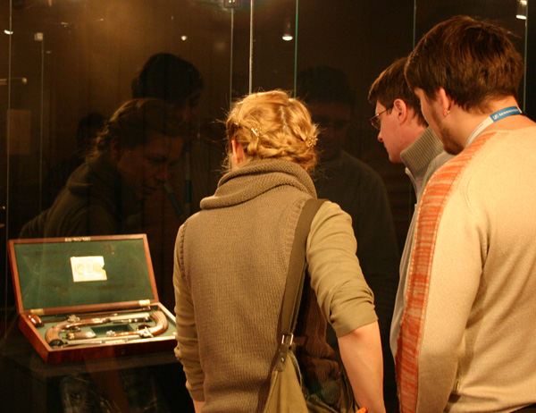 В стеклянной витрине, в дуэльном фирменном ящике лежат те самые пистолеты, которые лишили нас воздуха русской поэзии – Александра Сергеевича Пушкина.