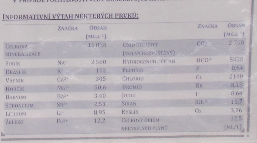 Йодированная лечебная щелочная гидрокарбонатно-хлоридно-натриевого типа минеральная вода средней минерализации = 7, с высоким содержанием СО² и большим количеством различных химических элементов. Приятна на вкус. Открытого источника нет, он выведен в павильон. Если бы вода текла свободно, возможно была бы ещё вкусней))).