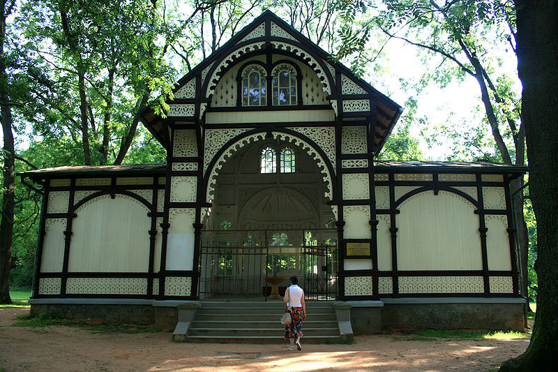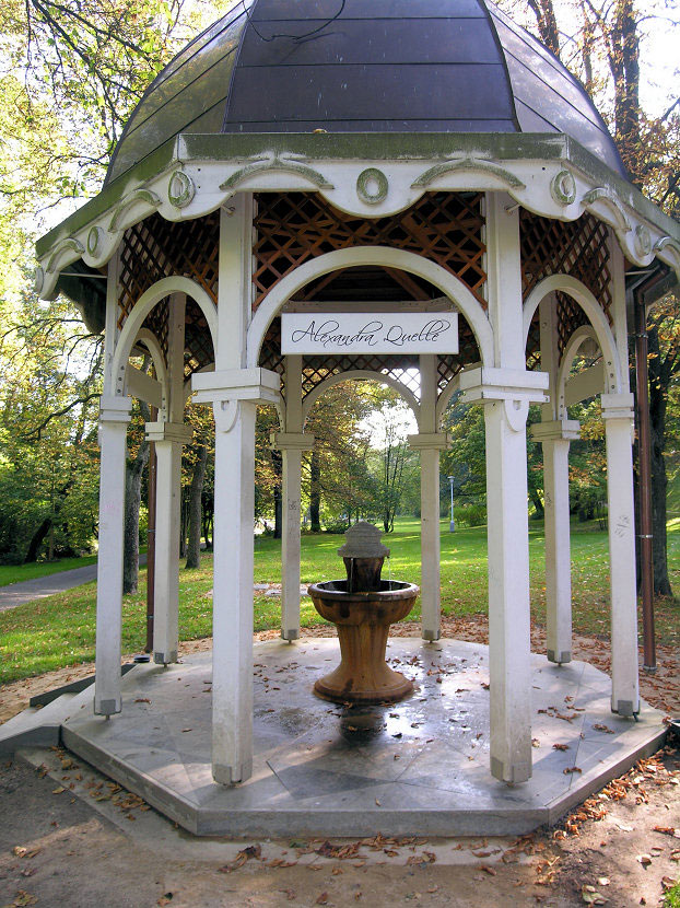 Своё название источник получил в честь великой княгини Александры, которая лечилась в Мариенбаде (Марианских лазнях). Ажурная беседка с бюветом в виде чаши, с текущей минеральной водой, гармонично смотрелась в аллеях парка. За день до этого, проходя мимо этого источника, текущей воды мы не видели. А тут — ба, вода льётся из всех «краников». Попробовали, обычная столовая минеральная вода, слабо газированная.