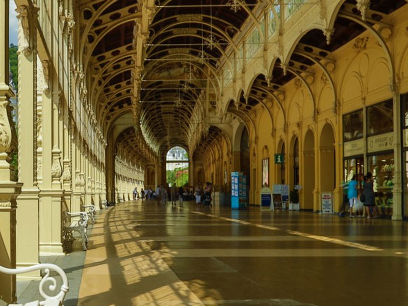 к нему идём через длинную арочную галерею. Народу — море, все, не спеша, прогуливаются и попивают воду из курортных кружечек с носиком. Мы проходим через «колоннаду»