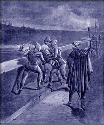 Под покровом ночи, при тусклом свете луны, после мучительных пыток, которым подвергся викарий из Помука Янек (так звали Яна Непомуцкого при жизни), стражники короля Вацлава IV вынесли его обессиленное тело из резиденции бурмистра. Они шли к мосту через Влтаву. Но несколько прохожих, завидев стражей короля, укрылись в тёмных уголках моста и настороженно наблюдали за действием палачей. Подойдя к середине моста, где Влтава была наиболее глубока, стражники сбросили тело викария