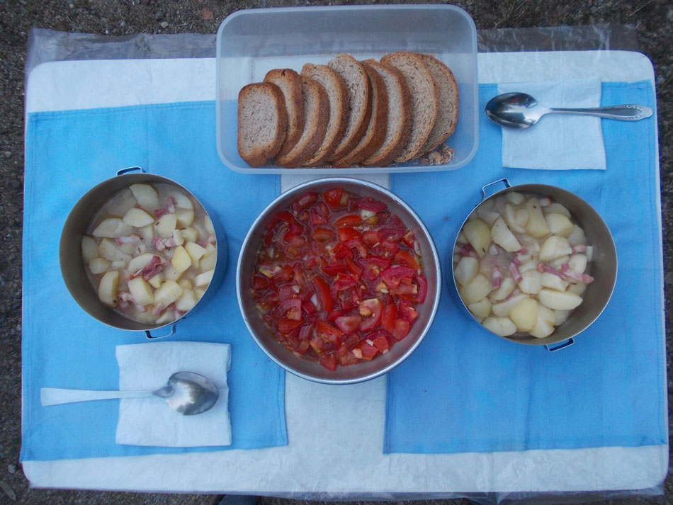 Превосходное блюдо на стоянках – тушёный картофель с копчёностями и тмином. Готовится с момента закипания воды 20 — 30 минут. Запах копчёной корейки несравним ни с чем. Пикантность придаёт тмин. Уплетается моментально, особенно, если ты сидишь, как мы, на свежем воздухе, посреди соснового бора.