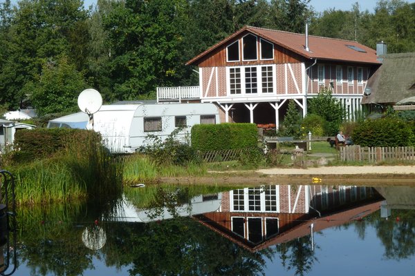 «голая» часть территории кемпинга, а для палаток участки в лесу. Есть малюсенькое озерцо, в нём с удовольствием бултыхалась детвора, к ним присоединялись и взрослые, если было уж очень жарко. Но воды до пояса, поэтому сподручнее было сидеть на дне, высунув голову.
